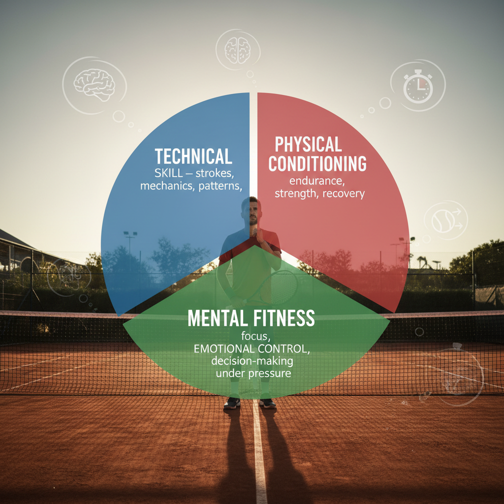 Tennis has always been a sport obsessed with precision. We analyze grips, refine footwork, track spin rates, and condition the body to endure long matches under heat and pressure. Coaches spend thousands of hours perfecting technique and physicality. Players chase marginal gains in speed, strength, and biomechanics. And yet, the most decisive moments in tennis rarely come down to any of those things. They happen in silence. Between points. After a missed forehand. At 30–40 on serve. Walking to the baseline after a double fault. This is where matches are won or lost. And this is where the sport is fundamentally undertrained. Tennis has a 33% problem. If you break performance into three core components, the imbalance becomes obvious: Technical Skill – strokes, mechanics, patterns, Physical Conditioning – endurance, strength, recovery and Mental Fitness – focus, emotional control, decision-making under pressure